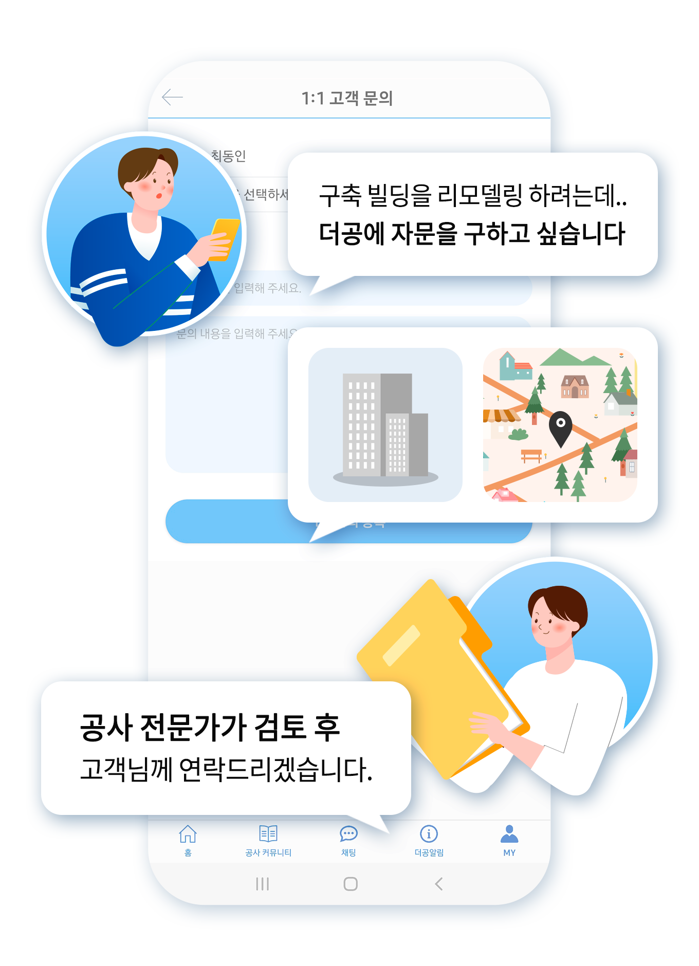 전문지식이 없어도 누구나 신청할 수 있습니다. 공사하고 싶은 부분을 사진, 동영상 또는 도면, 서류들을 찍어서 첨부해주세요. 신청한 공사에 대한 자세한 내용은 공사 전문가들이 분석합니다. 많은 내용을 올릴수록 더욱더 꼼꼼하게 체크됩니다.
