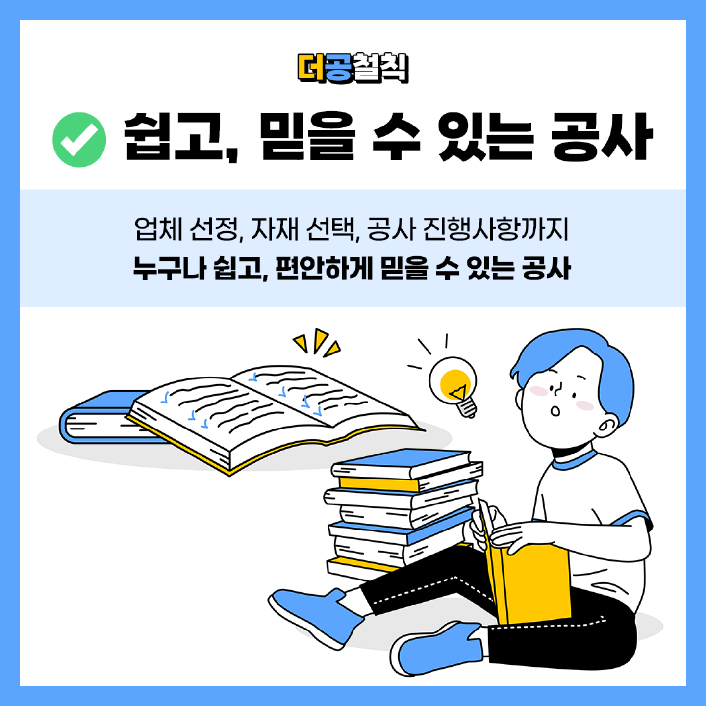 전문지식이 없어도 누구나 신청할 수 있습니다. 공사하고 싶은 부분을 사진, 동영상 또는 도면, 서류들을 찍어서 첨부해주세요. 신청한 공사에 대한 자세한 내용은 공사 전문가들이 분석합니다. 많은 내용을 올릴수록 더욱더 꼼꼼하게 체크됩니다.