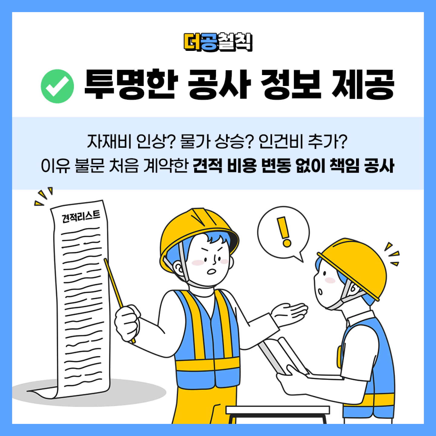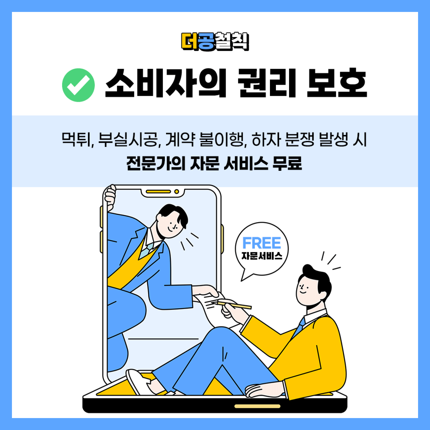 공사계약은 걱정 없이 자체 전자계약으로 이루어집니다.(대형 로펌 검토완료) 계약에 따른 계약이행보증과 공사완료에 따른 하자이행보증은 당연히 챙길 수 있습니다. 추후 기간 내 하자에 대한 부분은 언제든 공사한 업체가 책임을 가지고 보수합니다. 업체와의 불화는 더공이 관여하여 조언 및 해결해드립니다.