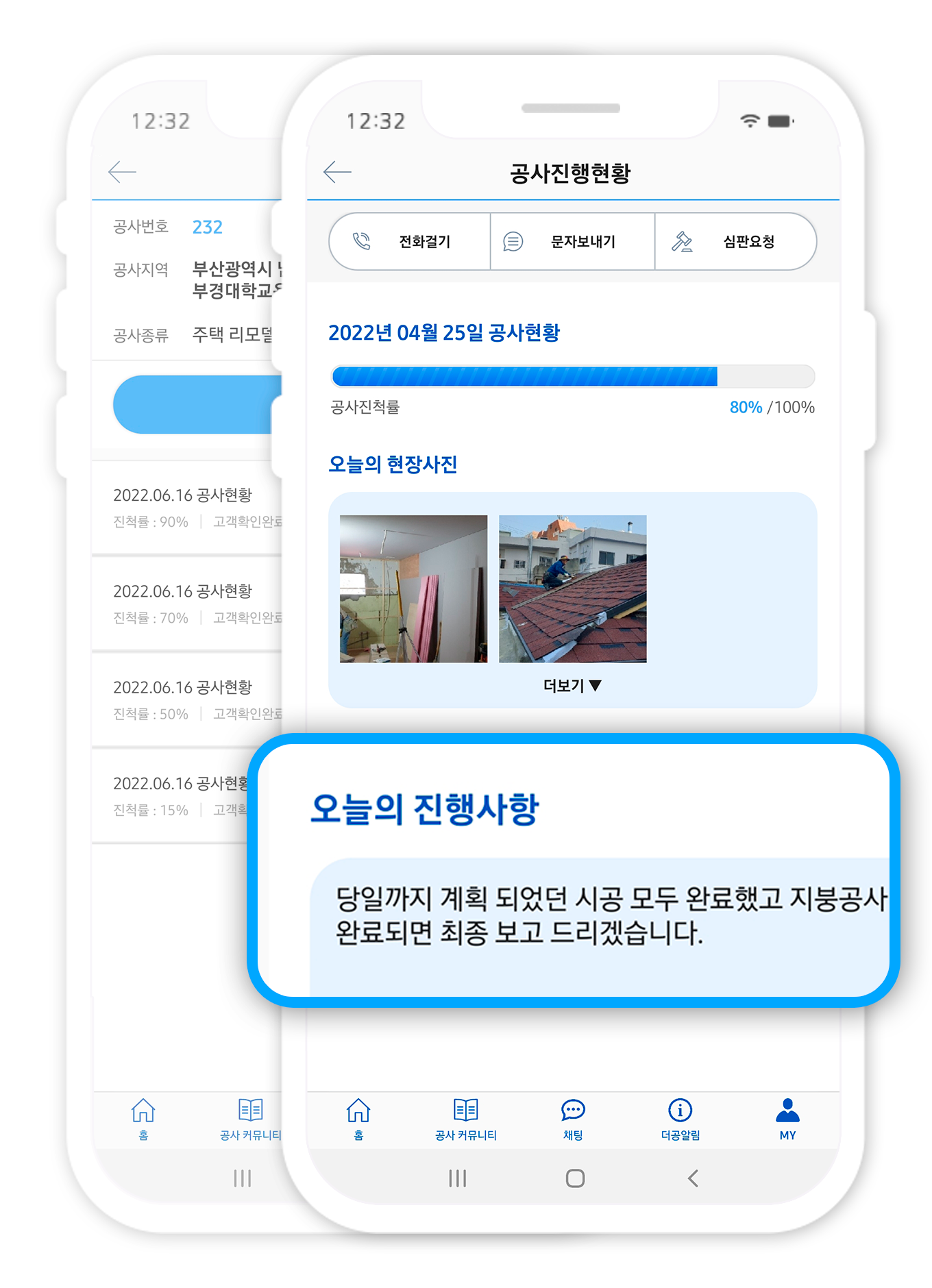 언제 어디서든 내 공사 진행내용을 바로 확인할 수 있습니다. 개선사항 등이 필요하면 바로 업체에게 당당하게 요구하세요. 매일매일 공사내용과 사용 자재들을 업체를 통해 확인할 수 있습니다. 공사 진행률과 전체 과정을 한눈에 볼 수 있습니다.